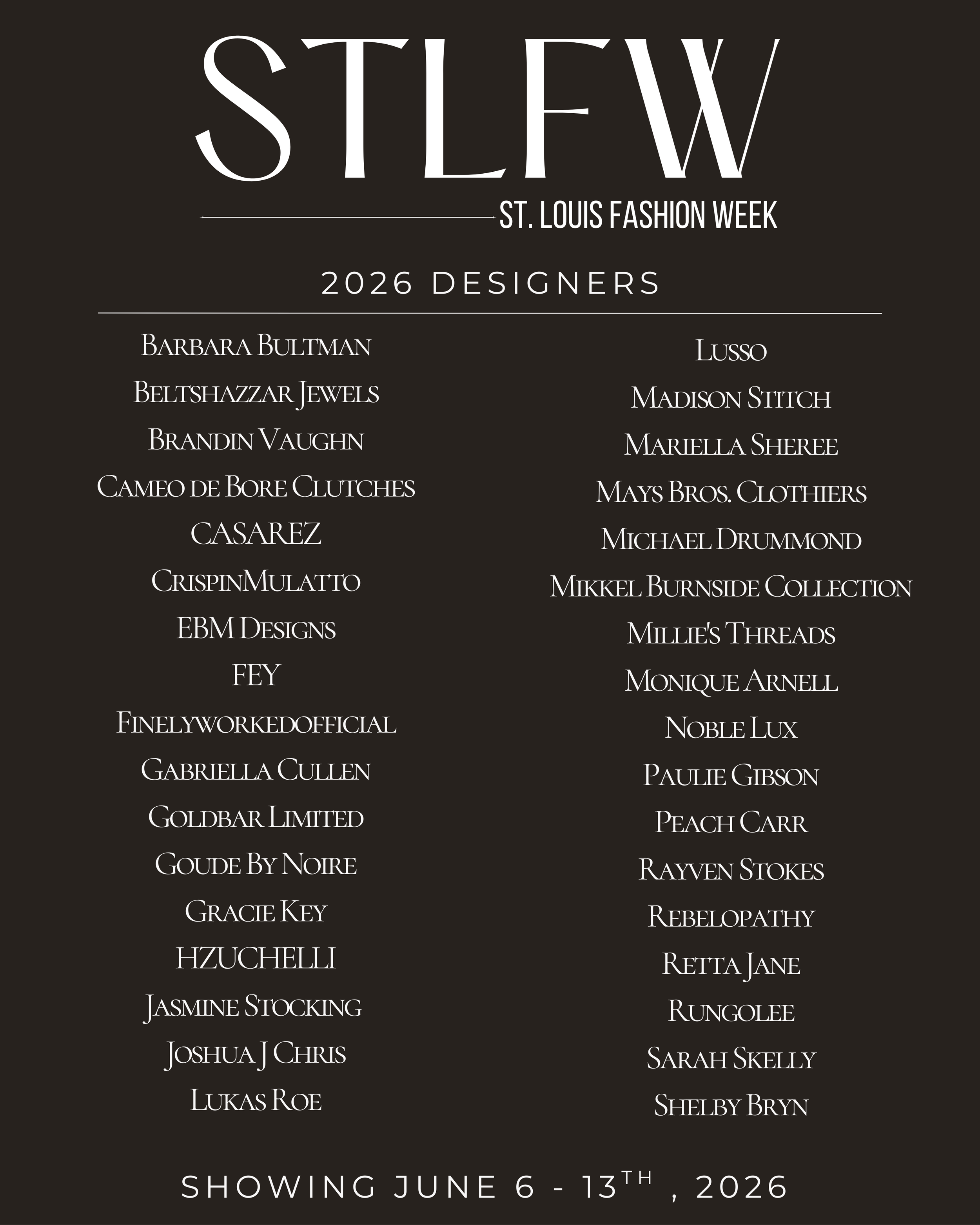 Saint Louis Fashion Week is proud to unveil the 34 designers selected for our highly anticipated 2026 return.